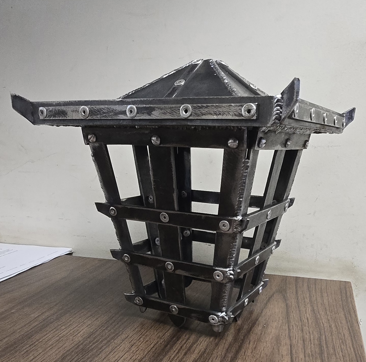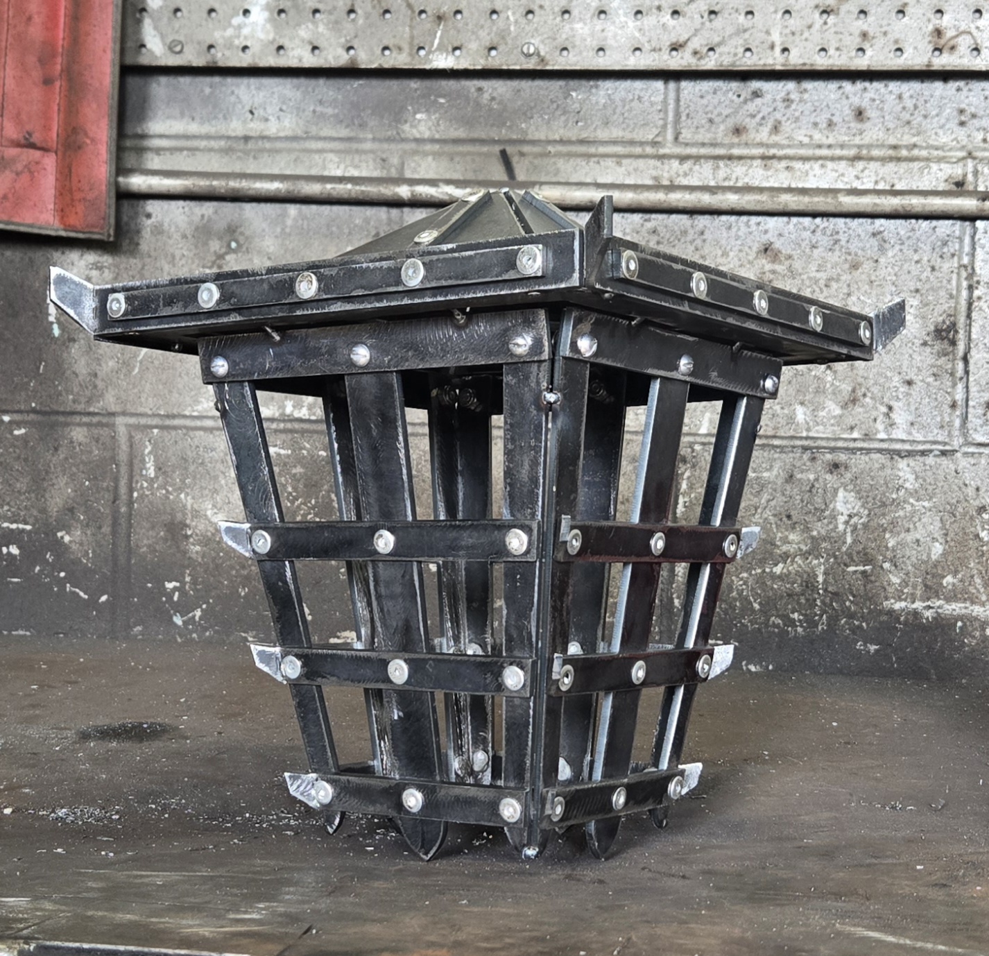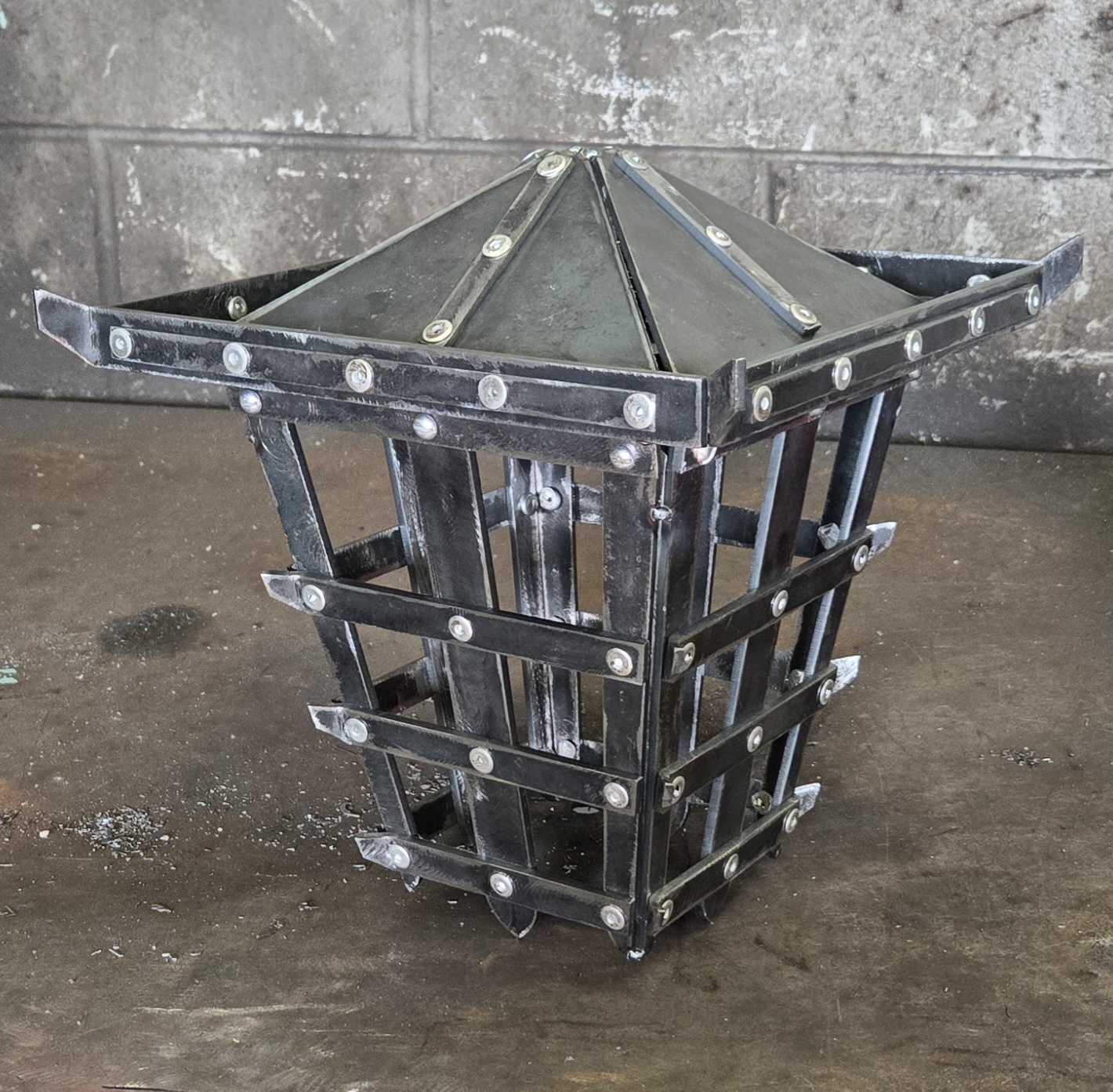 Medieval hanging lamp! This one will take a bit! I added water drain holes to the roof (8) for outside use. If you use the amazon listing for the 4" flat led you will have to cut the electrical box in half so it fits in the top of the lamp, It will also fit in thru the bottom while assembled you will need 80 rivets to assemble (or if you would like the cage part to be removable so you can put glass in it you will need 68 rivets and 12 bolts). I added a 2.5" ring to weld to the top but i ended up buying one so it was rounded. I also added a small washer for under the hanging ring to prevent more water from getting into the .75" hole in the roof. all the sides have a decorative point that gets bent 45 degrees to add a decorative flair. Happy welding!