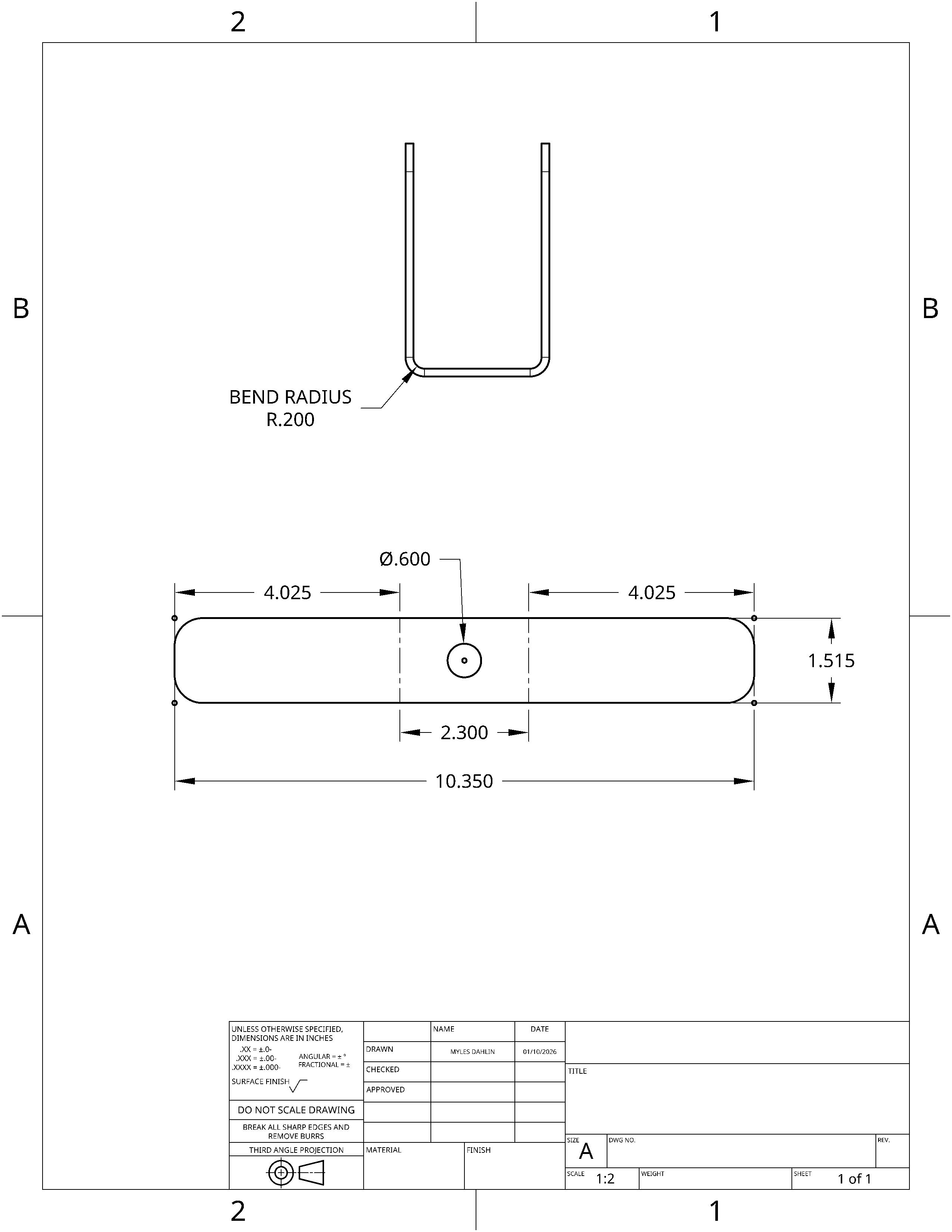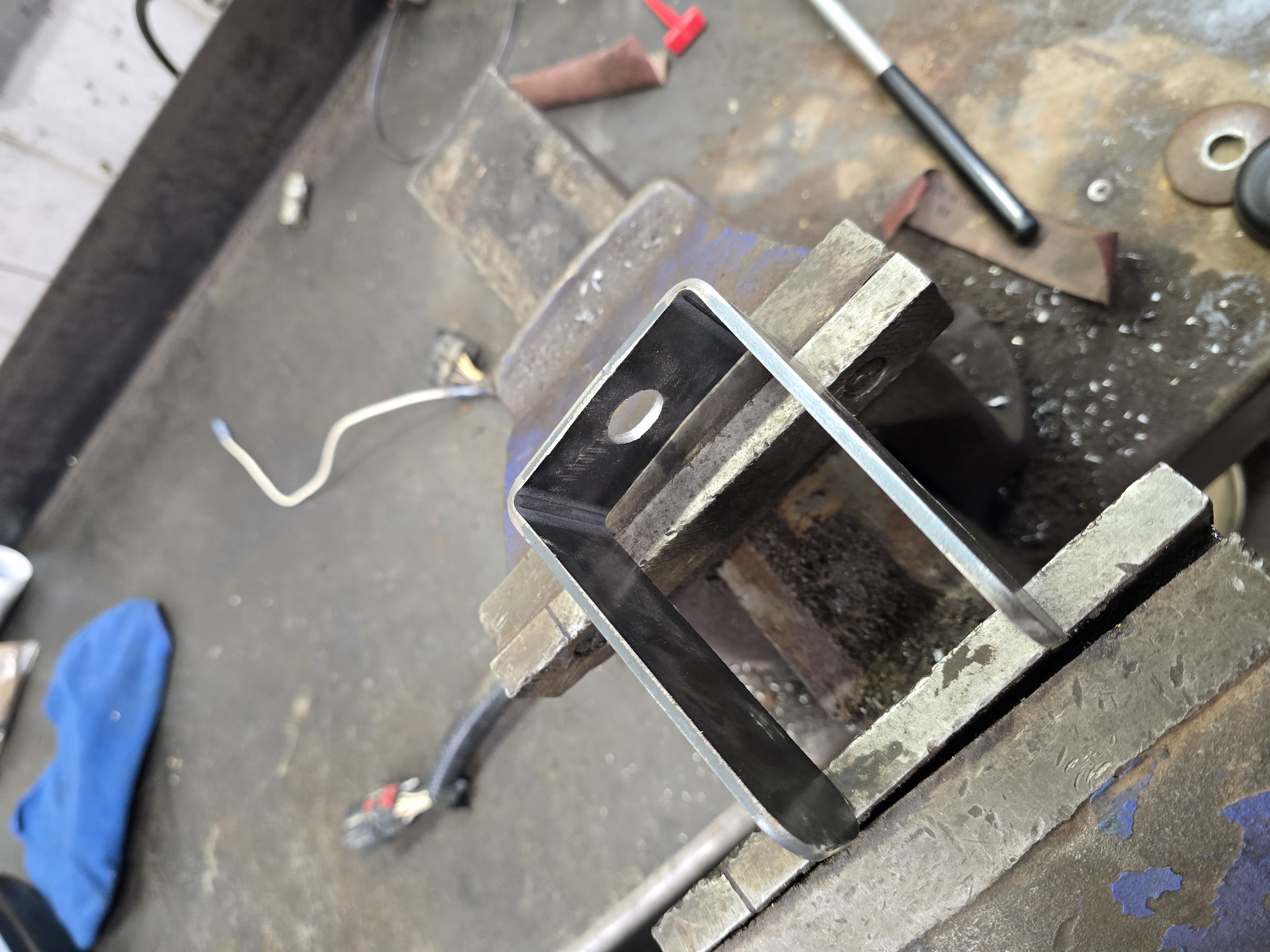 Had a front lower shock bracket on my friends 2022 Ram 2500 break (See pics). From the factory the tab is only welded to one side of the mount to the axle. We decided to make a bracket that could be welded on both sides to beef it up. Part drawing is included with the bend lines represented. Between the legs should be no less than 2 1/4". Getting a weld on the backside of the bracket is a bit of a pain but not impossible. We cut this out of 10 gauge steel sheet (.140") and it is plenty strong. The shock mountings should be the same from 2019 up to 2025.
